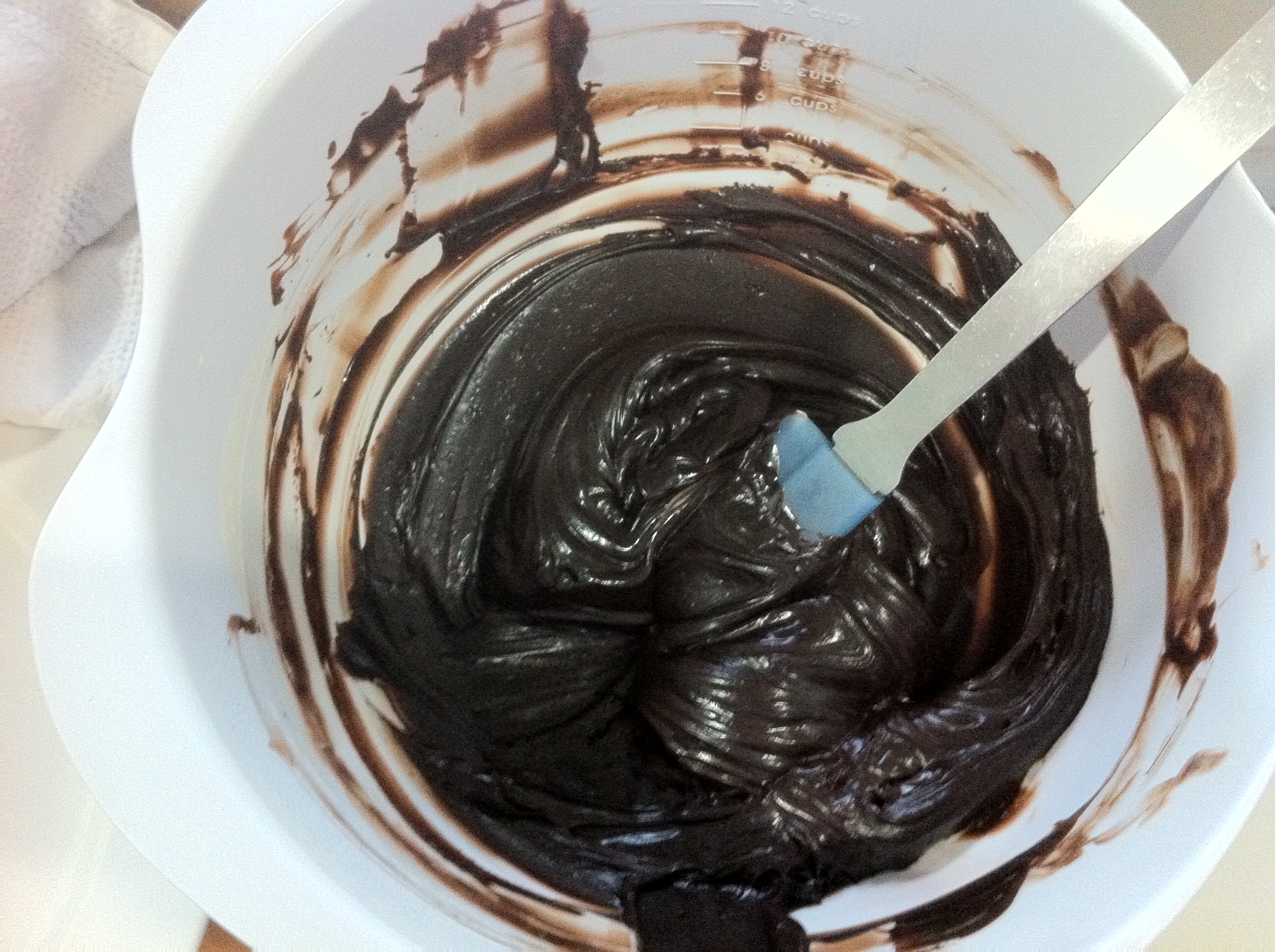 I poured the batter into my perfectly battered cake dish. P was shouting with delight, making up some sort of cake-baking song. I set the timer for 25 minutes and quickly made the ganache.
